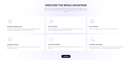 In Kombination mit der proprietären WebTrader-Plattform – mit fortschrittlichen Charting-Funktionen, sofortiger Ausführung und Kompatibilität mit verschiedenen Geräten – bietet SPOVA ein reibungsloses und wettbewerbsfähiges Trading-Erlebnis.