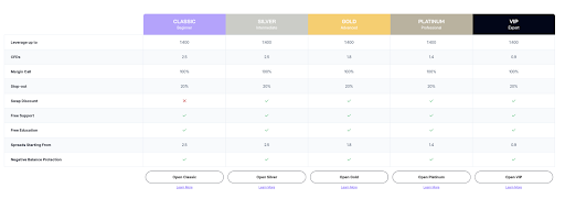 SPOVA bietet fünf maßgeschneiderte Kontotypen, die jeweils auf unterschiedliche Handelsbedürfnisse – vom Einsteiger bis zum erfahrenen Profi – zugeschnitten sind. Alle Konten beinhalten einen Hebel von bis zu 1:400, Schutz vor negativen Kontoständen, kostenlosen Support, kostenlose Schulungen, Margin Call bei 100 % und Stop-Out-Level bei 20 %.