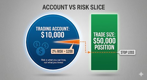 Here is the most important point many traders miss: the 2% refers to how much you can afford to lose, not how much you invest in the trade. You can enter a $50,000 position while only risking $200 of your $10,000 account — if your stop-loss is placed accordingly. This distinction is fundamental.