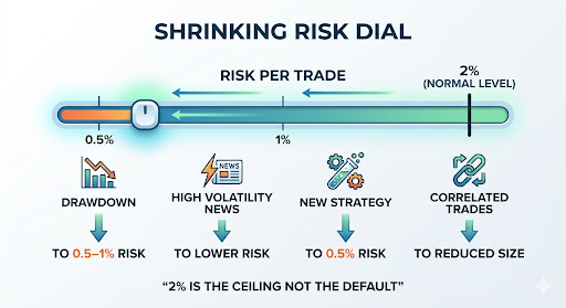 - During drawdowns: If you are down 10% or more, consider dropping to 0.5–1% until you recover.