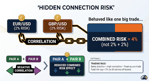 One of the most overlooked risks in forex is currency pair correlation. If you hold simultaneous long positions in EUR/USD and GBP/USD, you are not truly running two independent 2% risk trades — you are running one large position with double the effective exposure, because both pairs tend to move in the same direction against the USD.