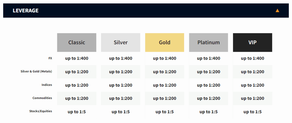 - 금속 레버리지: 최대 1:200 (예: 금, 은)