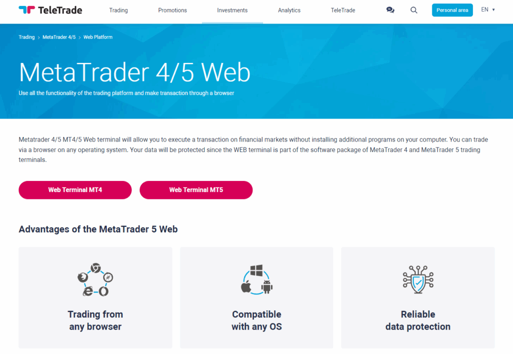The broker offers a wide selection of trading platforms to accommodate every trader’s needs, highlighted by the versatile MetaTrader 4 and MetaTrader 5 suites. These platforms are accessible via the web, allowing trading directly from any browser without the need for additional software, and are compatible across various operating systems, ensuring ease of access and security. For those who prefer desktop solutions, TeleTrade provides MT4 and MT5 for Windows, offering a native, feature-rich trading experience. Mobile traders aren’t left behind, with dedicated apps for iOS and Android devices enabling trading on the go.
