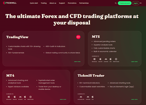 MT4, MT5, Tickmill Trader, CQG, AgenaTrader, TradingView